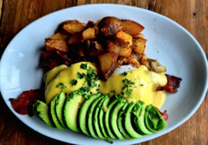 Golden, glossy, and unapologetically indulgent, Cottonwood Café’s poached eggs deliver exactly what a proper brunch should. Silky hollandaise drapes over perfectly set eggs, giving way to rich yolks that melt into crispy bacon and buttery avocado. Add in a side of crisped potatoes, and you have a plate that feels both comforting and quietly elevated. This is the kind of dish that doesn’t need reinvention. It just needs a fork and a slow morning.